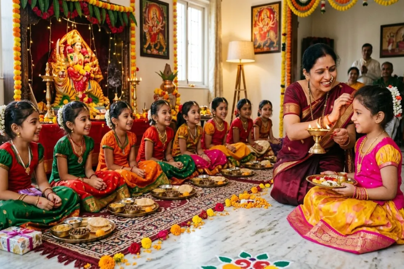 Unlike traditional worship that focuses only on idols, this ritual emphasizes serving and honoring the living form of the Goddess through young girls (kanyas).